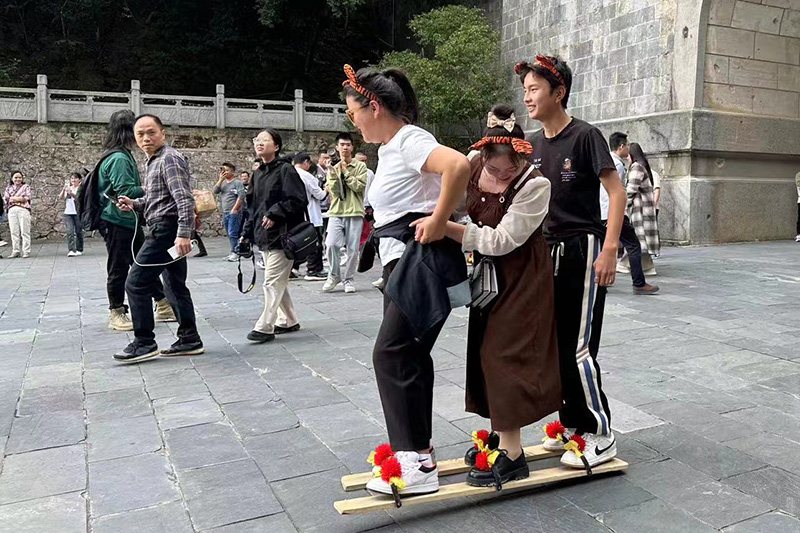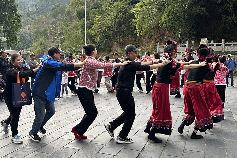 当天下午,友谊关景区开展了壮族板鞋、抛绣球、跳壮族舞蹈、品尝东南亚水果和当地特色小吃等活动,让“老铁们”感受南疆边关的风情。