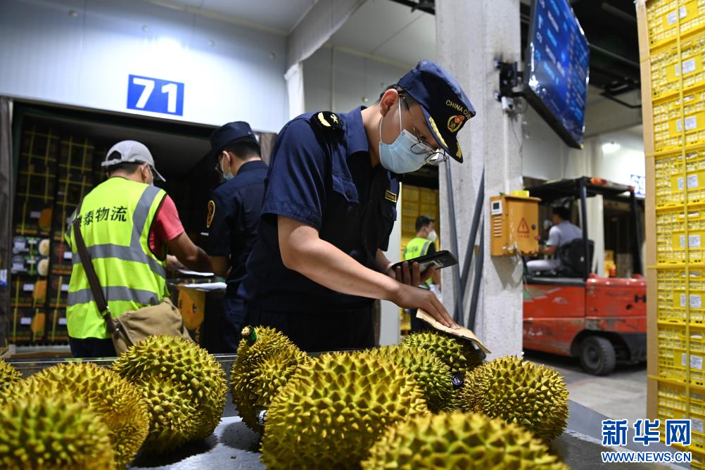 2023年9月12日,在广西凭祥友谊关口岸,海关工作人员对进口的榴莲进行查验。(曹祎铭 摄)