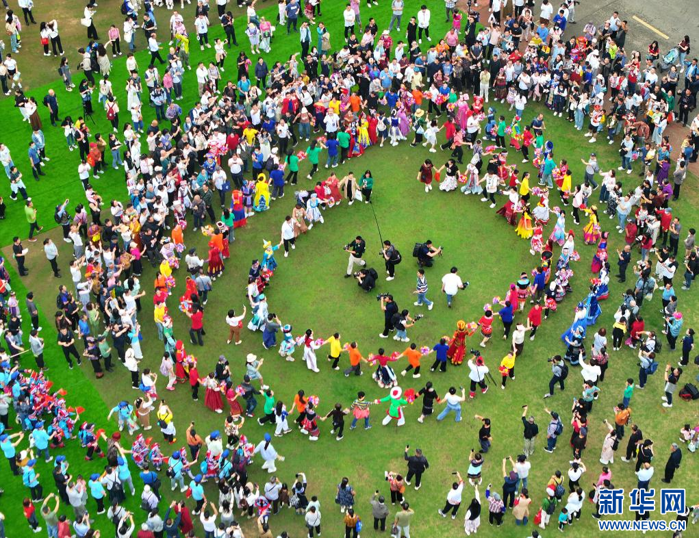 4月11日,游客和演员在广西南宁市“广西三月三·八桂嘉年华”活动会场跳舞庆祝(无人机照片)。新华社记者 周华 摄