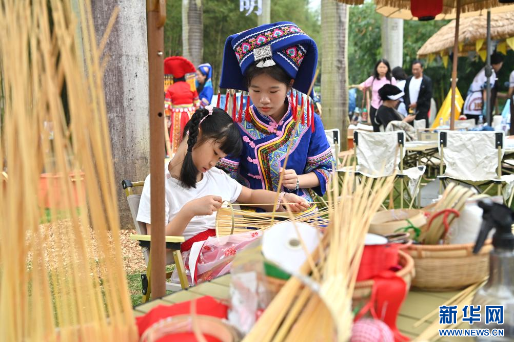 一名孩子在广西南宁市“广西三月三·八桂嘉年华”活动会场学习非遗技艺。新华社记者 周华 摄