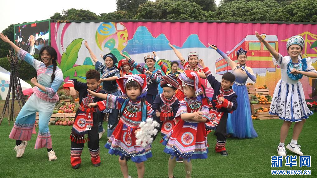 来自吉林的小朋友们正在跟演员一起表演舞蹈。 新华社记者 陈露缘 摄