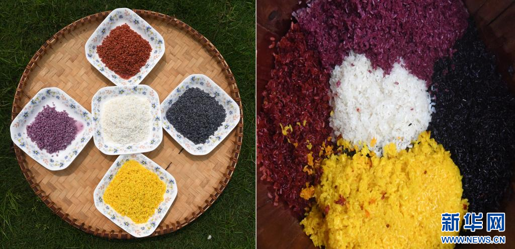 左图:4种不同植物色素染成的糯米和原色糯米;右图:刚刚蒸熟的五色糯米饭(拼版图片)。 新华社记者 陆波岸 摄