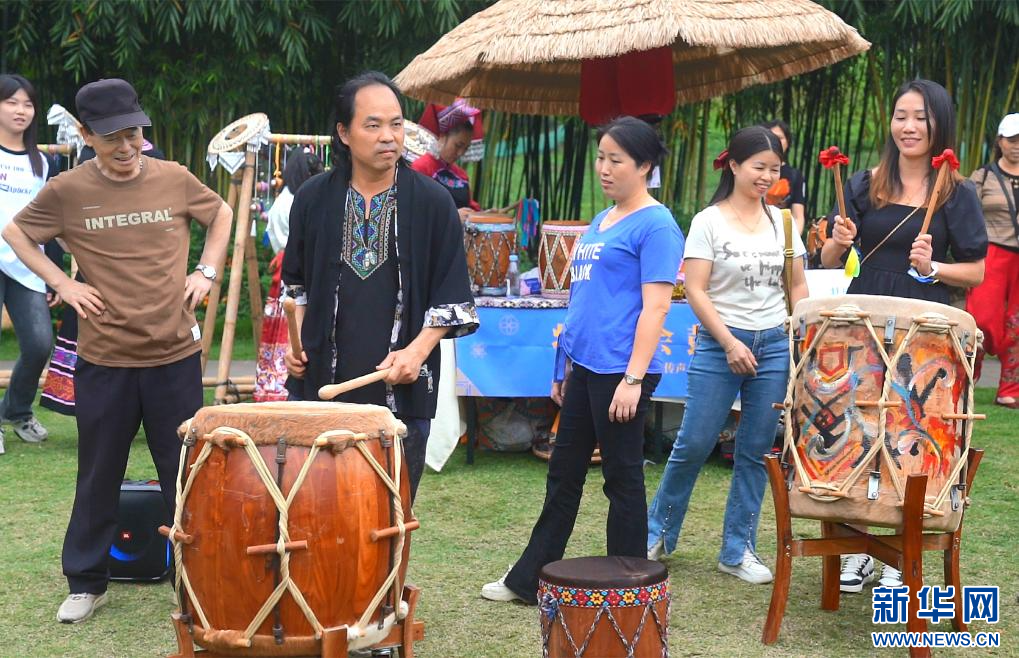 陈猛儒(左二)正在教游客打鼓。新华社记者 陈露缘 摄