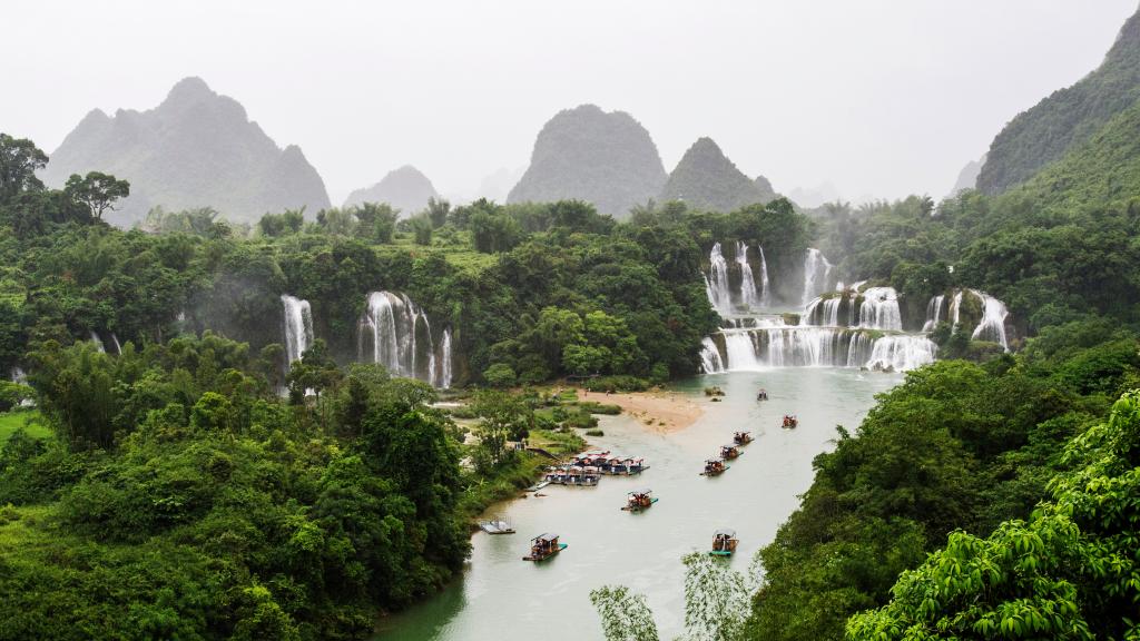 在中国和越南界河归春河上游,德天瀑布与紧邻的越南板约瀑布相连,形成亚洲最大跨国瀑布,奇特的喀斯特地貌和自然山水风光相得益彰,造就了中越边境线上一张靓丽的旅游名片。