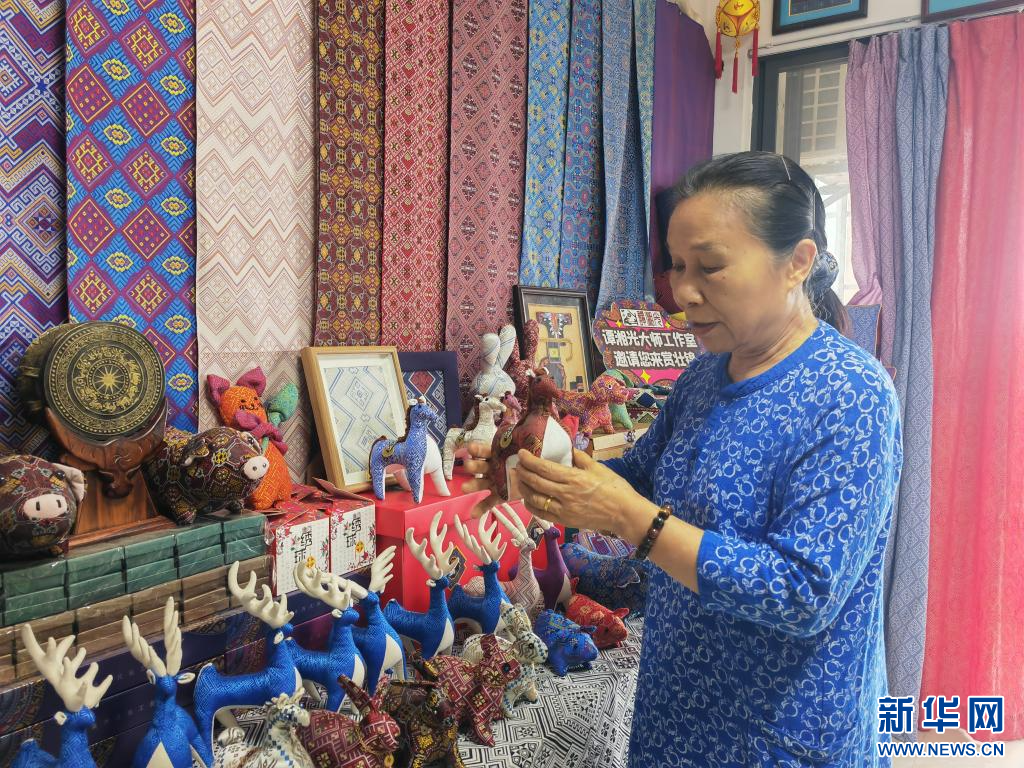 新华社南宁6月6日电(记者 黄浩铭)一排排形态各异的生肖玩偶,各式花纹图案的饰品,充满民族元素的领带、提包、挂件……在中国工艺美术大师、中国织锦工艺大师谭湘光的工作室里,用壮锦制作而成的产品琳琅满目。