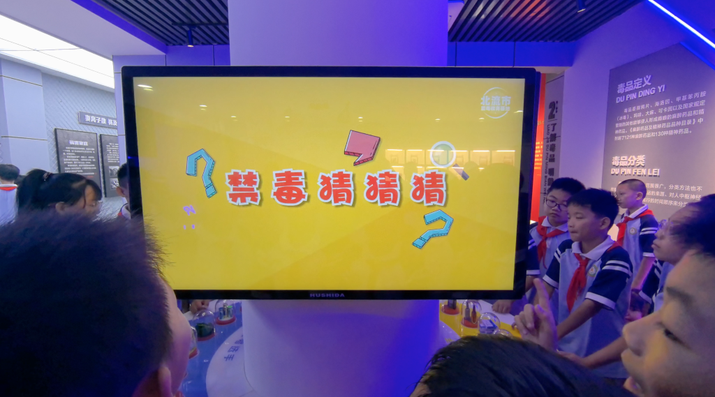 北流市禁毒教育基地展厅内设置有多个沉浸式互动体验项目,如“识毒课堂”,可以让参观者了解毒品的种类和危害;“人体扫描机”,可以了解吸食毒品后对人体各个器官的伤害;“贩毒双面人”,可以识破贩毒人员的伎俩,远离涉毒危险;通过模拟法庭,可以接受法治教育。