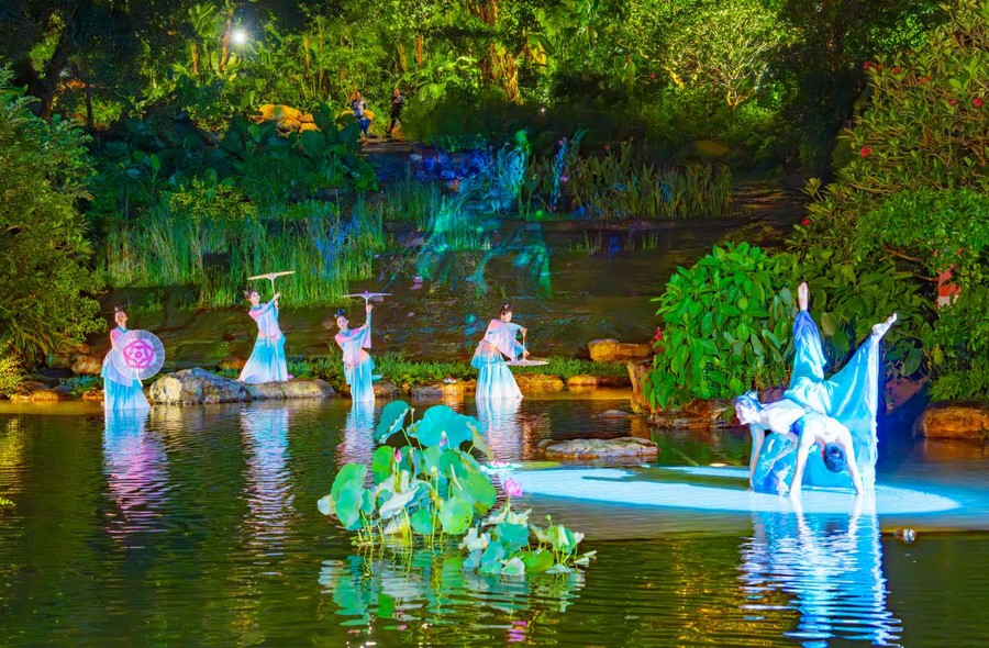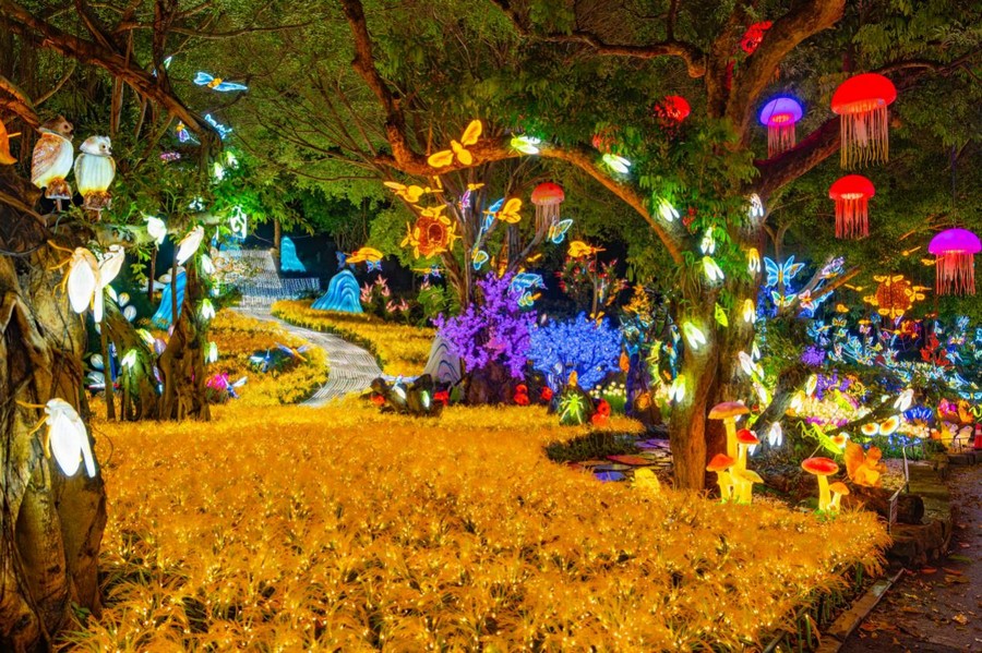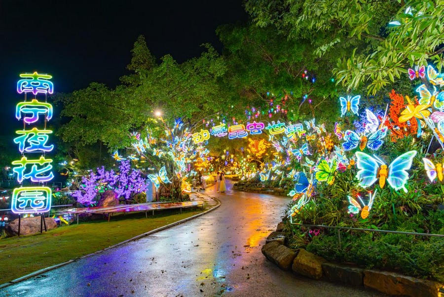 夜幕降临,青秀山依然热闹非凡。华灯初上,光影变幻,穿梭在青山绿水间,可尽情拍照打卡游玩。为丰富景区的文化旅游内容,塑造城市夜间旅游特色,青秀山风景区于2024年8月1日—11月17日在青秀山北门区:兰园、荫生植物园、桂花园区域举办“南宁夜花园”活动,为广大市民游客呈现一场艺术与色彩完美融合的视听盛宴。