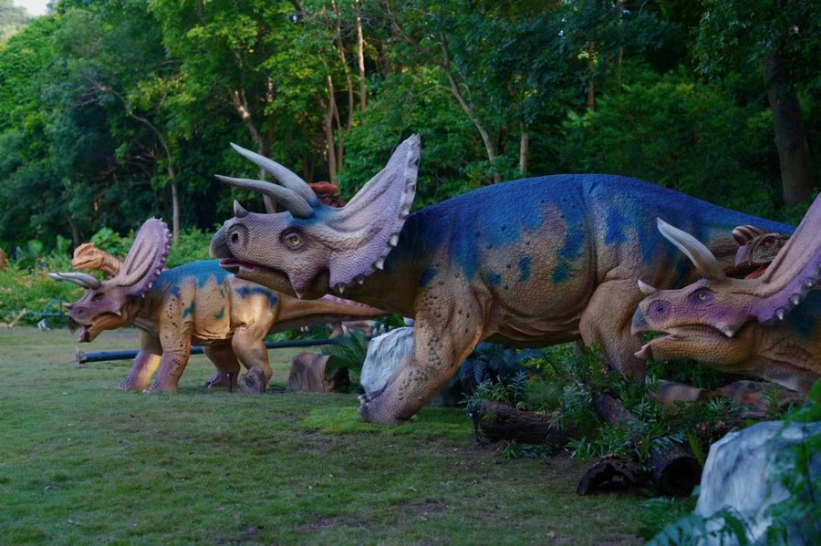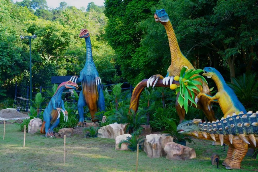 往绚兰花田方向走100米左右,按照指引,右转下台阶到达兰园大草坪,我们就来到了期盼已久的恐龙世界!现场有近60只体形硕大、形态各异、栩栩如生的“恐龙”,仿佛穿越侏罗纪公园!
