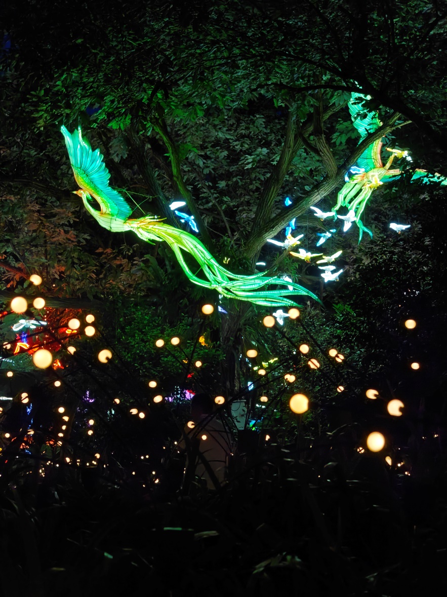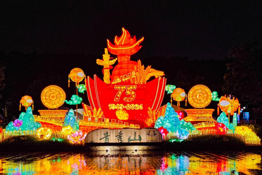 从北门进入,首先打卡75周年的“辉煌礼赞”,感受即将到来的国庆喜悦。在兰湖边上,我们还能看到巨大的“双龙呈祥”和梦幻天鹅灯组。