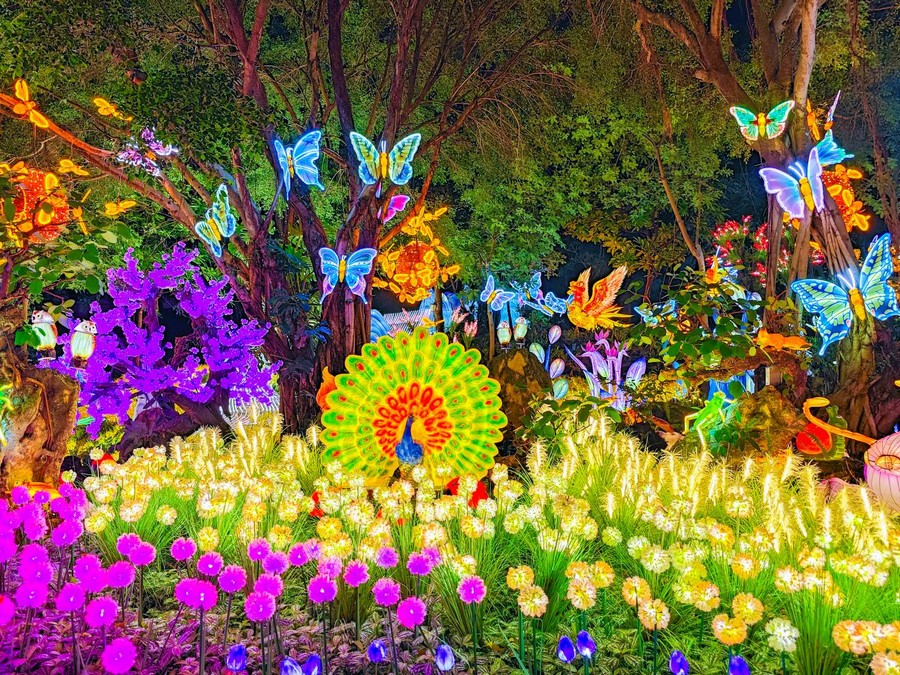 出花园市集,往金杉湖方向走,靠近兰园一侧前行,到达昆虫世界,大量造型各异、形态生动的“放大版”昆虫灯光造型,亲临一场仲夏花虫的视觉盛宴。