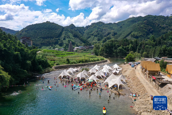 7月20日,在广西桂林市龙胜各族自治县乐江镇江口村,游客在戏水游玩(无人机照片)。新华社发(潘志祥 摄)