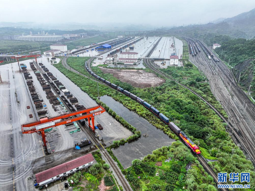 6月27日,西部陆海新通道中老泰马跨境铁路班列在重庆江津小南垭站发车(无人机照片)。新华社记者 唐奕 摄