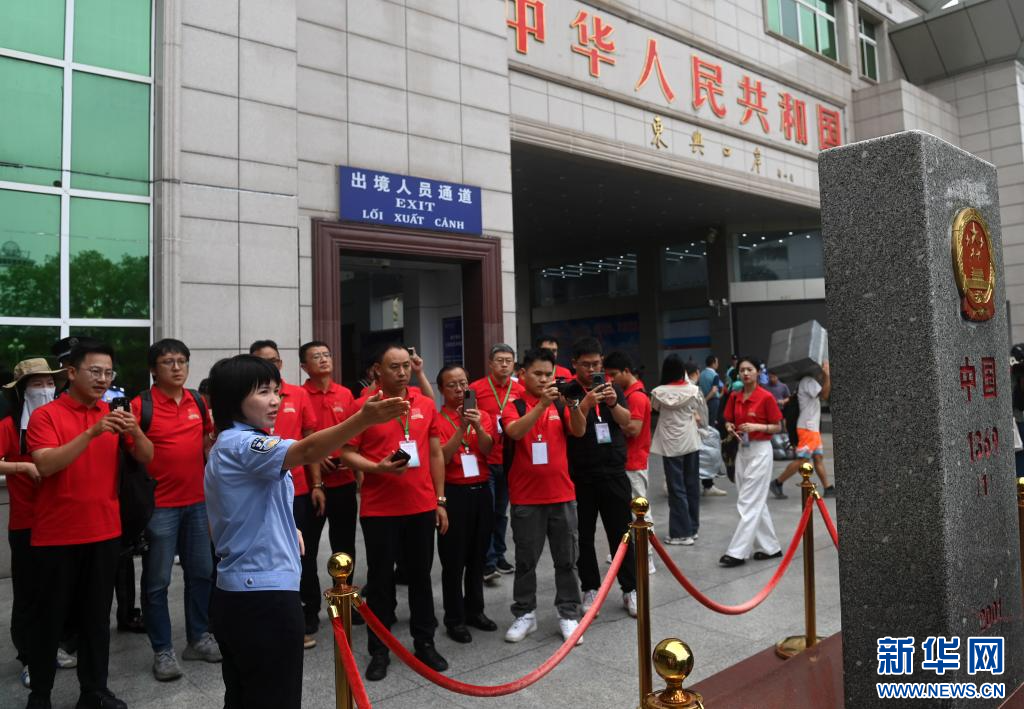 9月23日,巡访活动参加人员在广西东兴口岸界碑前听取有关情况介绍。新华社记者 陆波岸 摄