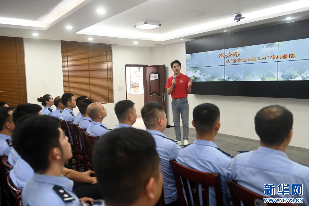 9月23日,在广西东兴边境派出所,来自广西交通投资集团南宁高速公路运营有限公司的黄龙游在进行巡讲。新华社记者 陆波岸 摄