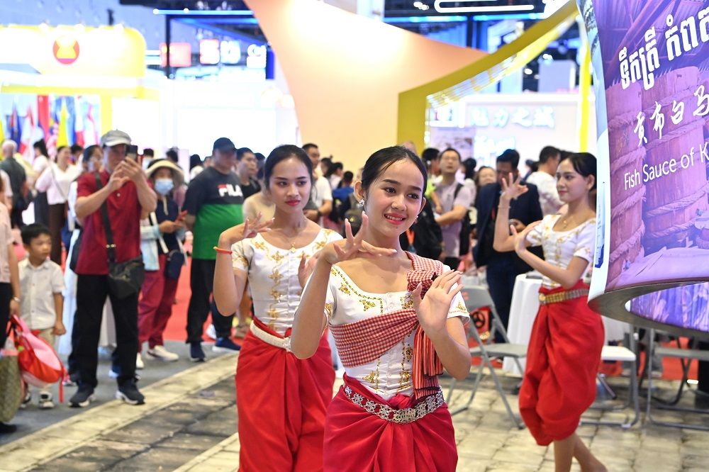 9月28日,柬埔寨演员在第21届中国-东盟博览会上表演舞蹈。(周华 摄)