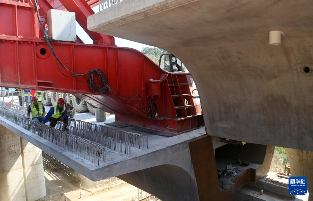 10月11日,在南凭高铁凭祥东站出站五线大桥上,中铁一局工人在施工铺架箱梁。