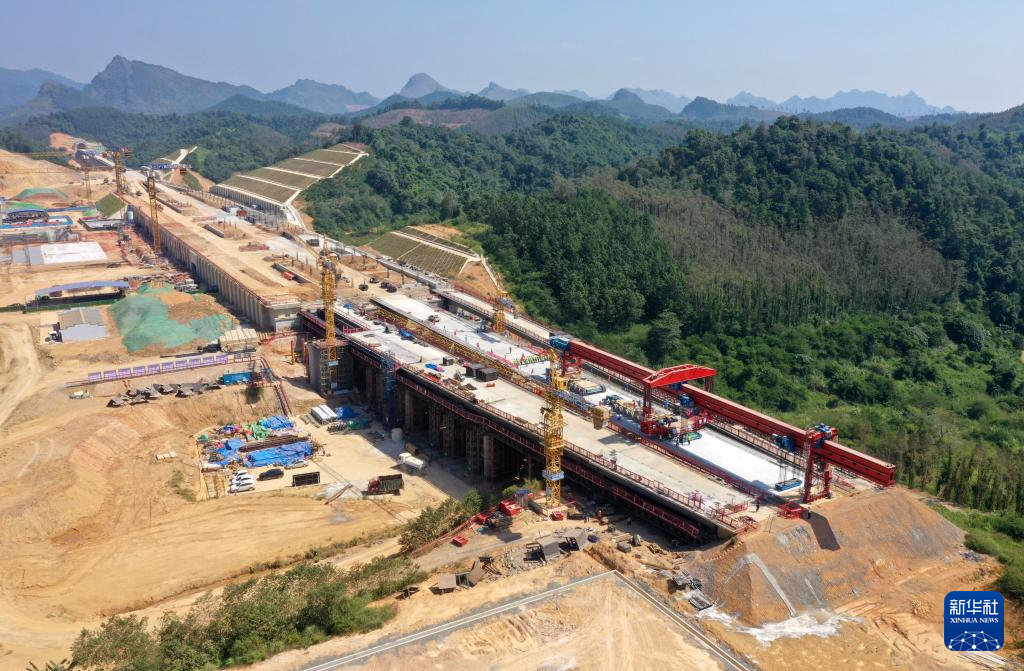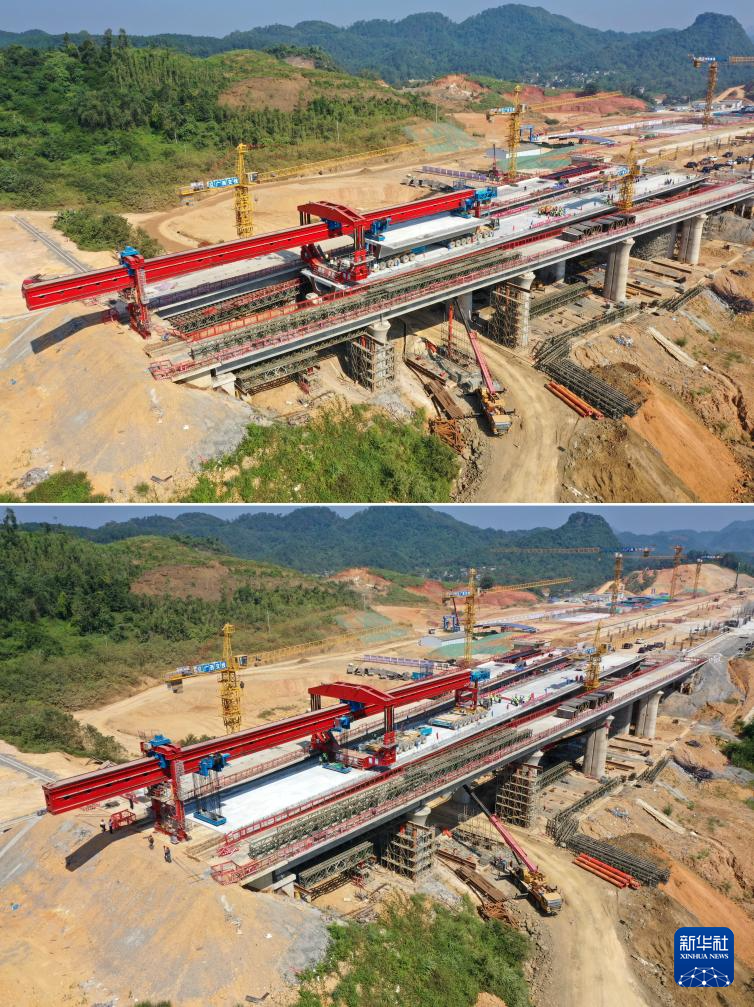 拼版照片:这是南凭高铁凭祥东站出站五线大桥贯通前(上图)后(下图)场景(10月11日摄,无人机照片)。