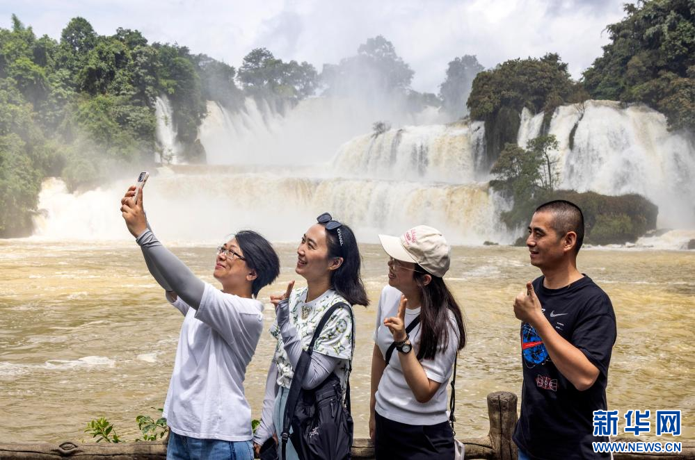 7月4日,游客在广西崇左市大新县德天瀑布景区拍照。(汤德宏 摄)