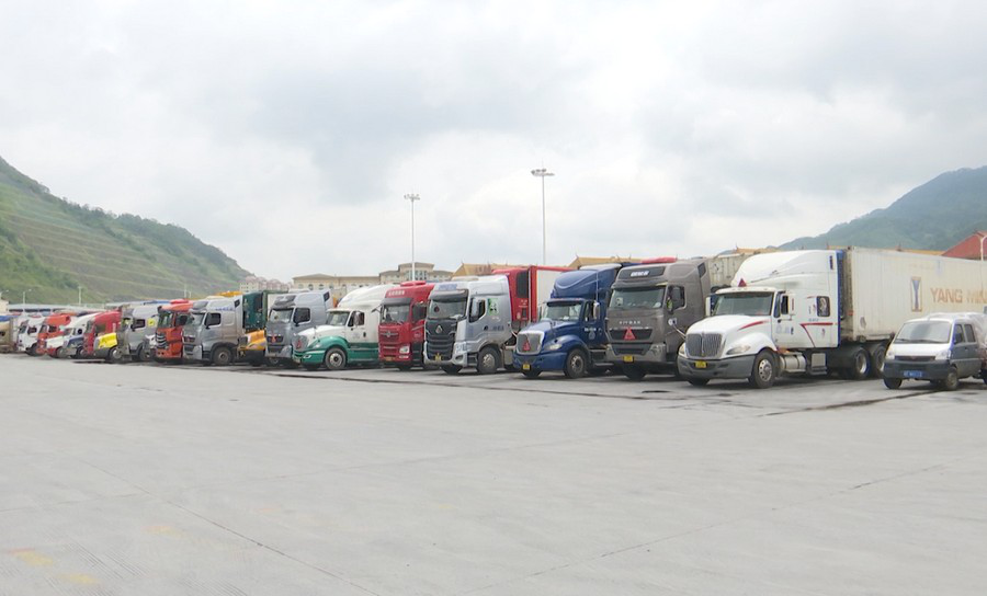 满载水果的货车等待海关查验。