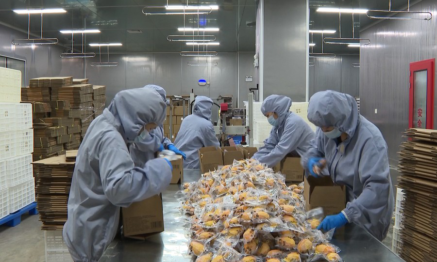在凭祥产业园区的广西中果实业有限公司生产车间,工人们进行芒果削皮、包装等加工作业。目前,该公司已承接冷冻果肉、果汁果浆等加工订单约1800吨,并与多家知名食品饮料企业及新茶饮品牌达成合作意向。
