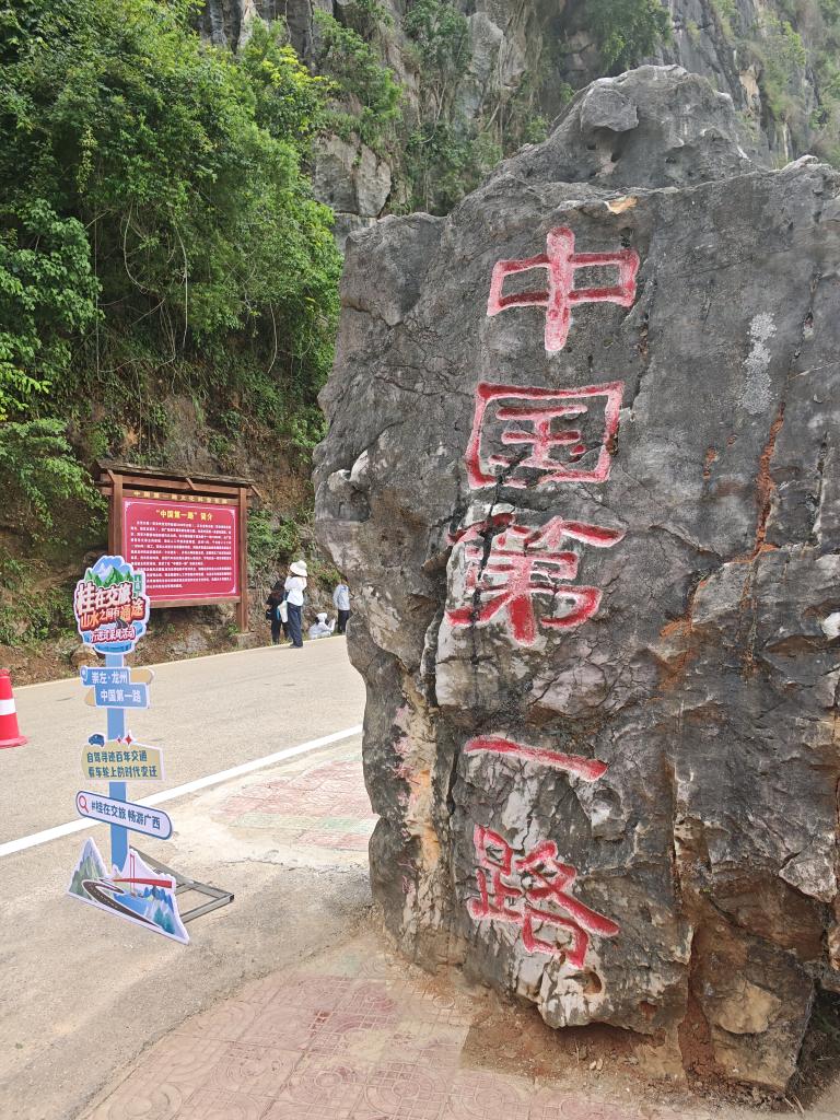 从友谊关出发,沿着国道322线转入县道456线,行驶一段时间后,就可到达龙凭公路观景台,这里有刻着“中国第一路”的石碑。龙凭公路连接龙州与凭祥友谊关,全长55公里,始建于1885年,是广西最早修建并通车的公路,也是中国第一条兼具国防、经济、贸易与旅游交流功能的公路。