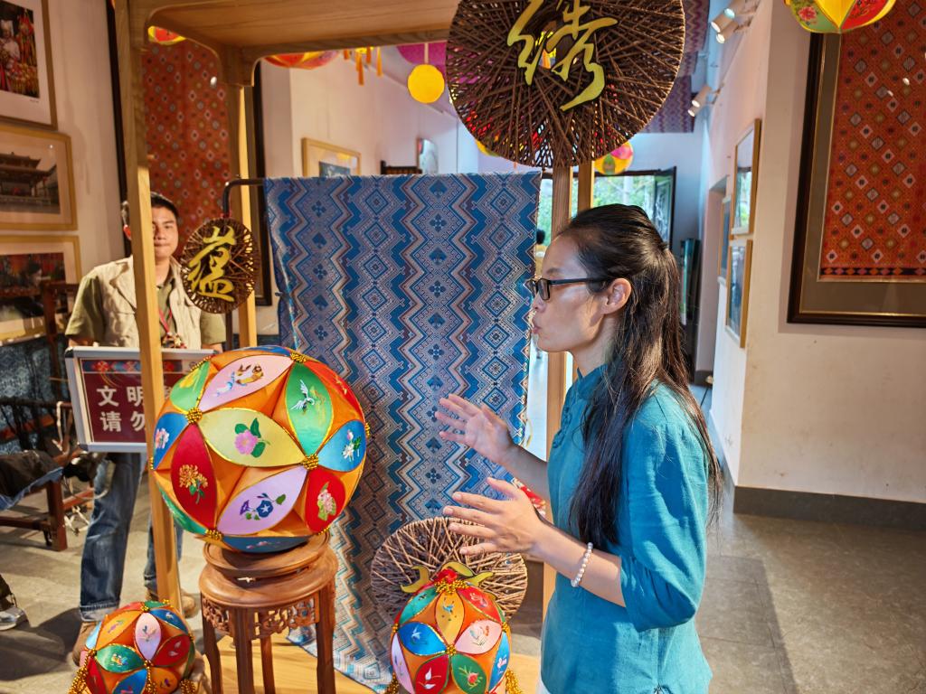 图为靖西绣球制作技艺代表性传承人王秀芬在介绍绣球制作技艺。新华社记者 华峻卿 摄