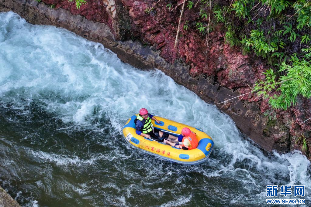 7月26日,在广西钦州市八寨沟景区,游客体验漂流(无人机照片)。