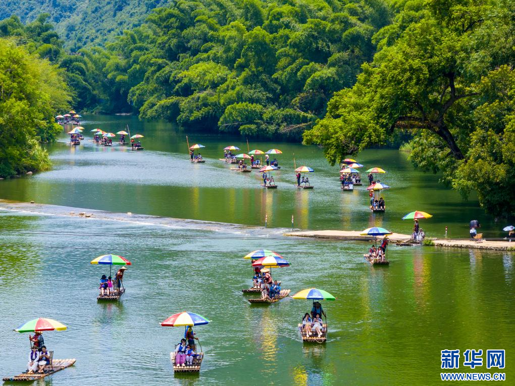 7月31日,人们在广西桂林市阳朔县遇龙河乘坐竹筏漂流(无人机照片)。