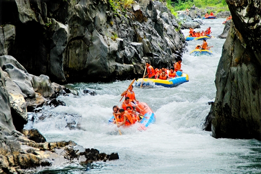 在五排河景区,一艘艘漂流艇在时而湍急、时而平缓的水流中顺流而下,翻腾的浪花、湍急的险滩带来阵阵欢呼,成群结队的游客在此乐此不疲。