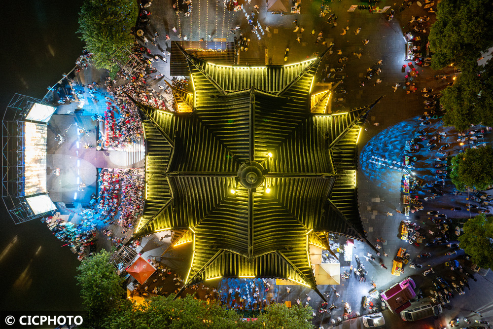 ↑2025年8月9日,市民和游客在广西梧州市蒙山县长寿阁广场观看演出、赏景游玩。(无人机照片)CICPHOTO/黄胜林 摄