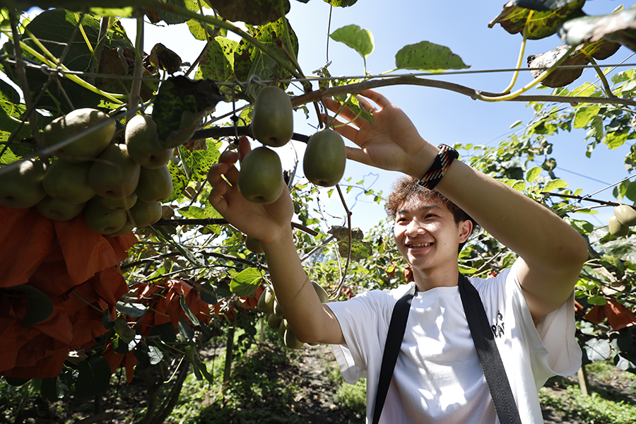 游客正在猕猴桃果园中体验采摘。