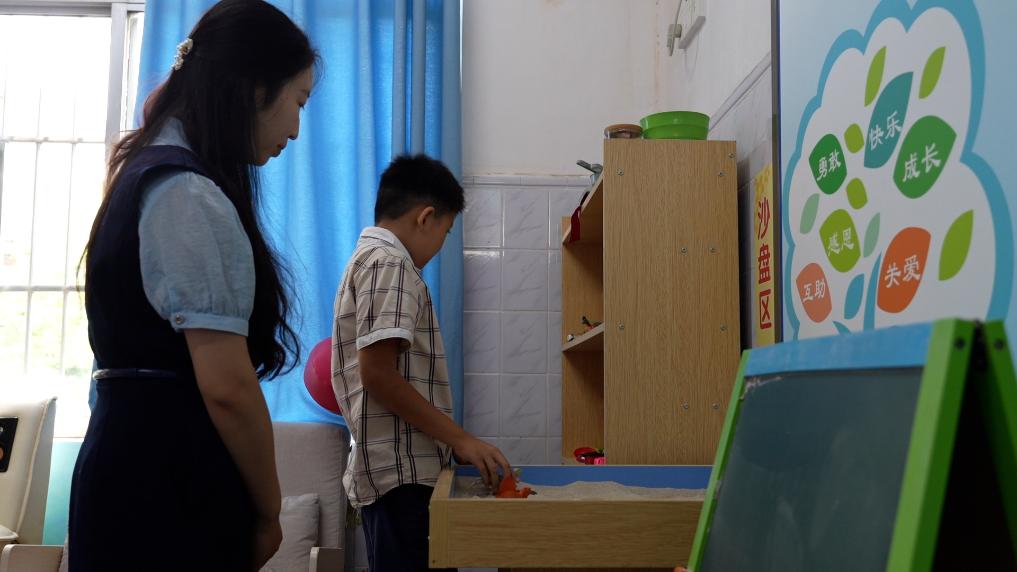 石颖怡陪伴小锐玩沙盘。新华社记者 覃广华 摄