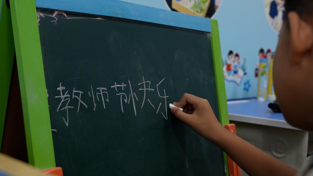 小锐在小黑板上书写“教师节快乐”。新华社记者 覃广华 摄