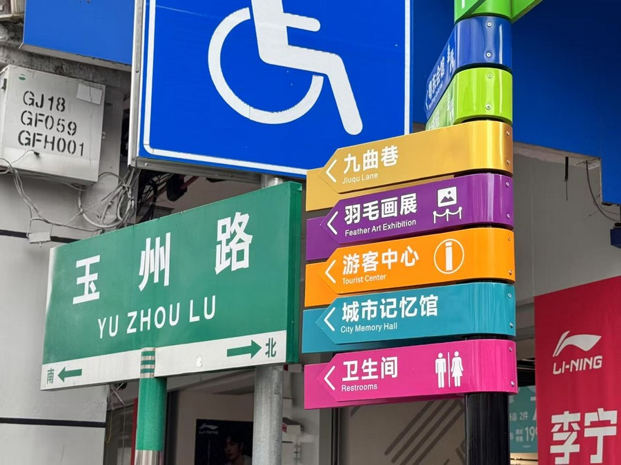 此外,十字街区域新增了多块旅游指示牌。这些指示牌设计简洁明了,兼具实用性与美观性,不仅标注了街区历史文化景点、公共设施方位,还融入了艺术季的主题活动信息,为市民和游客深度体验玉林的城市魅力提供便利。