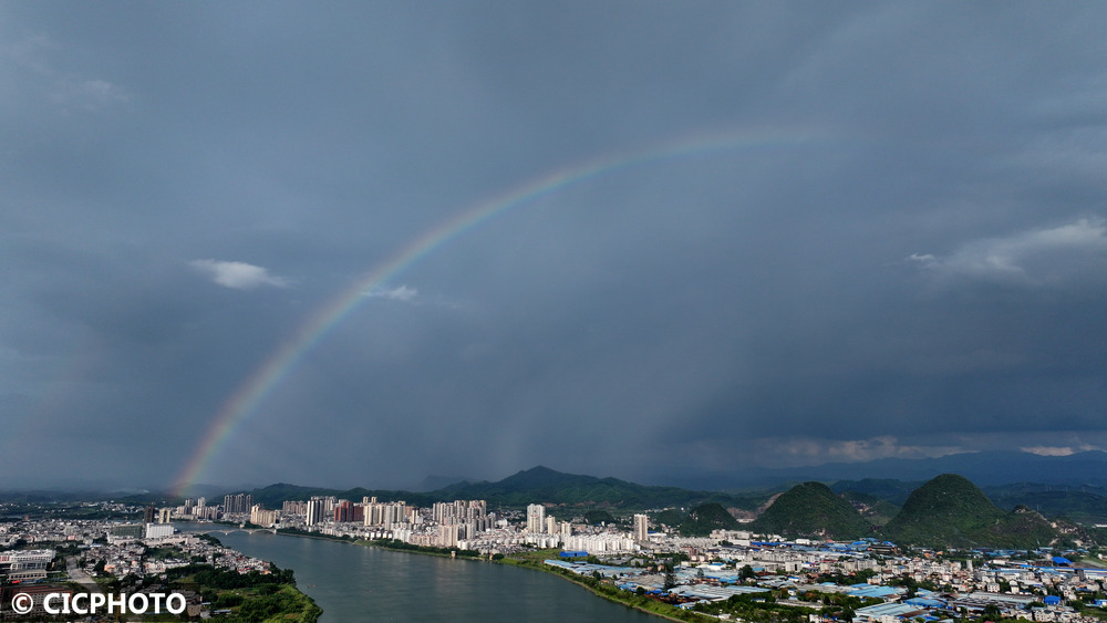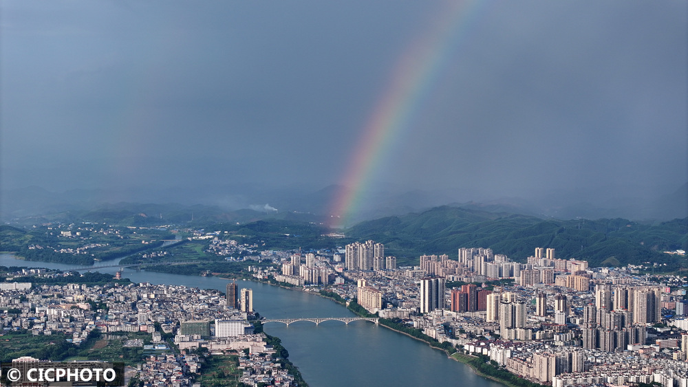 2025年9月11日午后,一场阵雨突袭广西柳州市融安县,给燥热的大地带来了一丝清凉。阵雨过后,融安县城的天空中架起了一道色彩鲜艳、边界清晰的绚丽彩虹,为桂北秋日增添一道靓丽的风景。