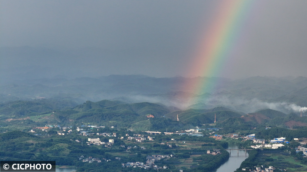 以上图片:2025年9月11日在广西柳州市融安县拍摄的雨后彩虹。(无人机照片)CICPHOTO/谭克兴 摄