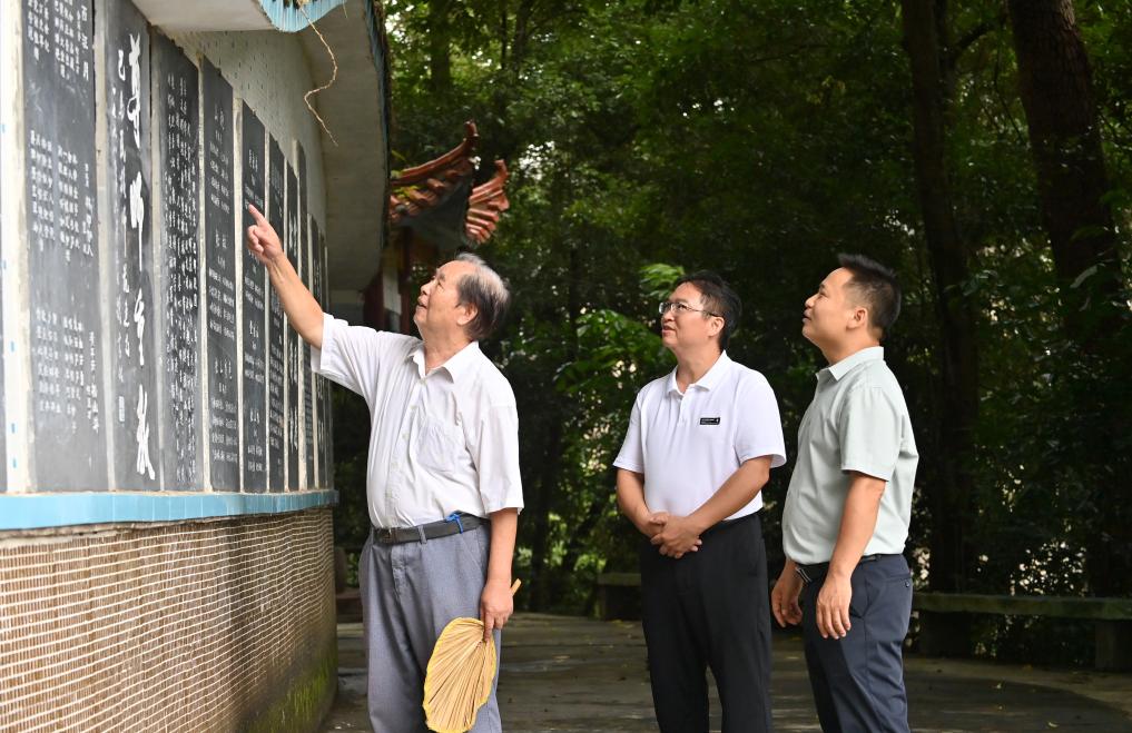10月15日,在广西河池市巴马民族师范学校桂岭碑林长廊,罗伏龙(左一)在谈诗词和书法创作体会。新华社记者陆波岸 摄