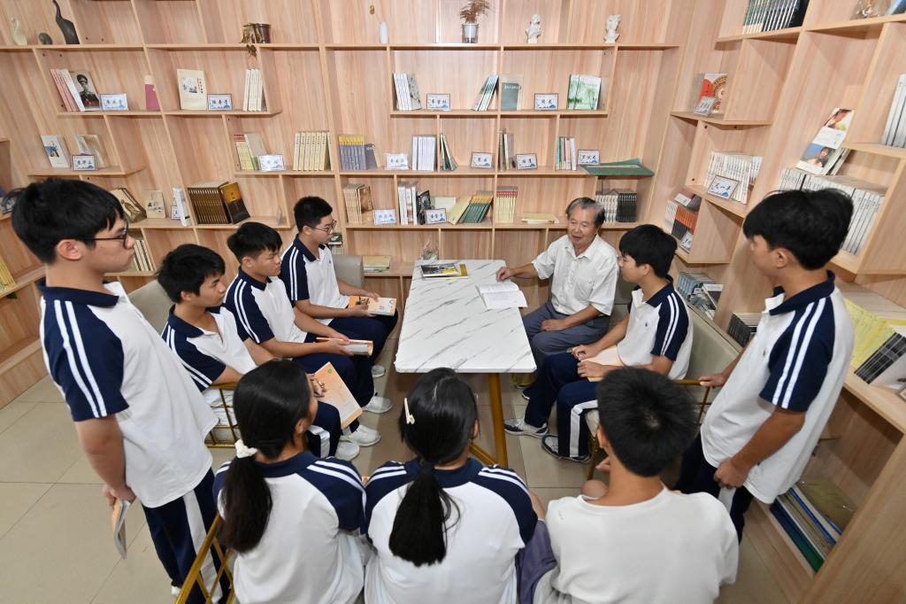 10月15日,在广西河池市巴马民族师范学校麒麟山文学馆,罗伏龙在和学生谈文学创作。新华社记者陆波岸 摄