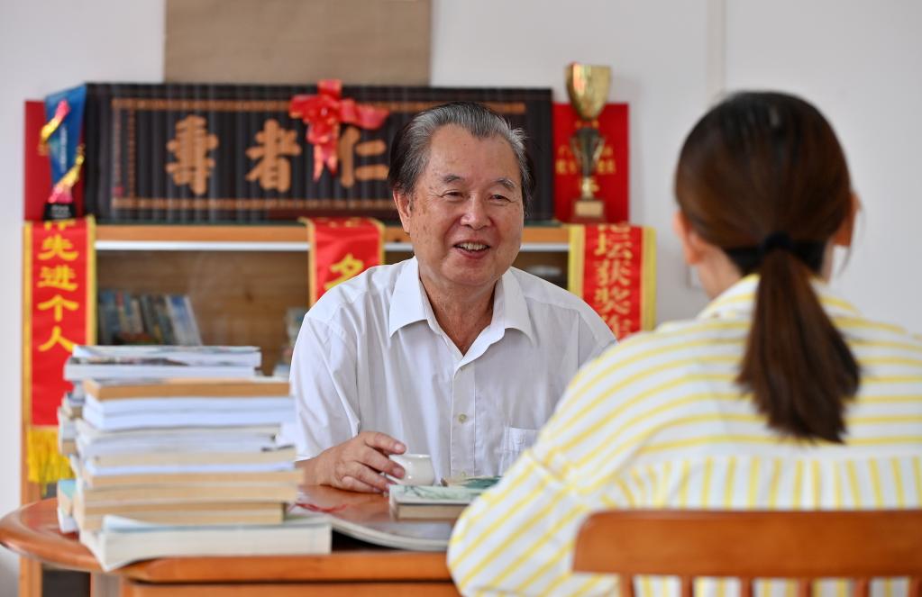 10月15日,在广西巴马瑶族自治县县城的家里,罗伏龙(左)在介绍自己退休后的文学创作情况。新华社记者陆波岸 摄