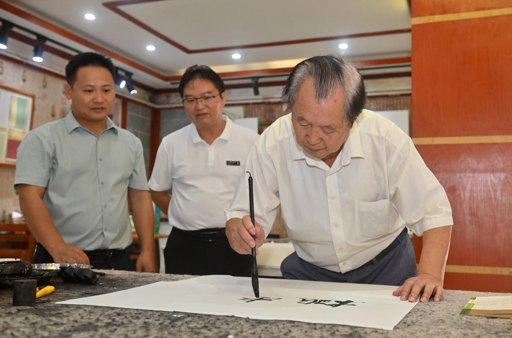 10月15日,在广西河池市巴马民族师范学校麒麟长寿养生书画苑,罗伏龙(右一)在练习书法。新华社记者陆波岸 摄