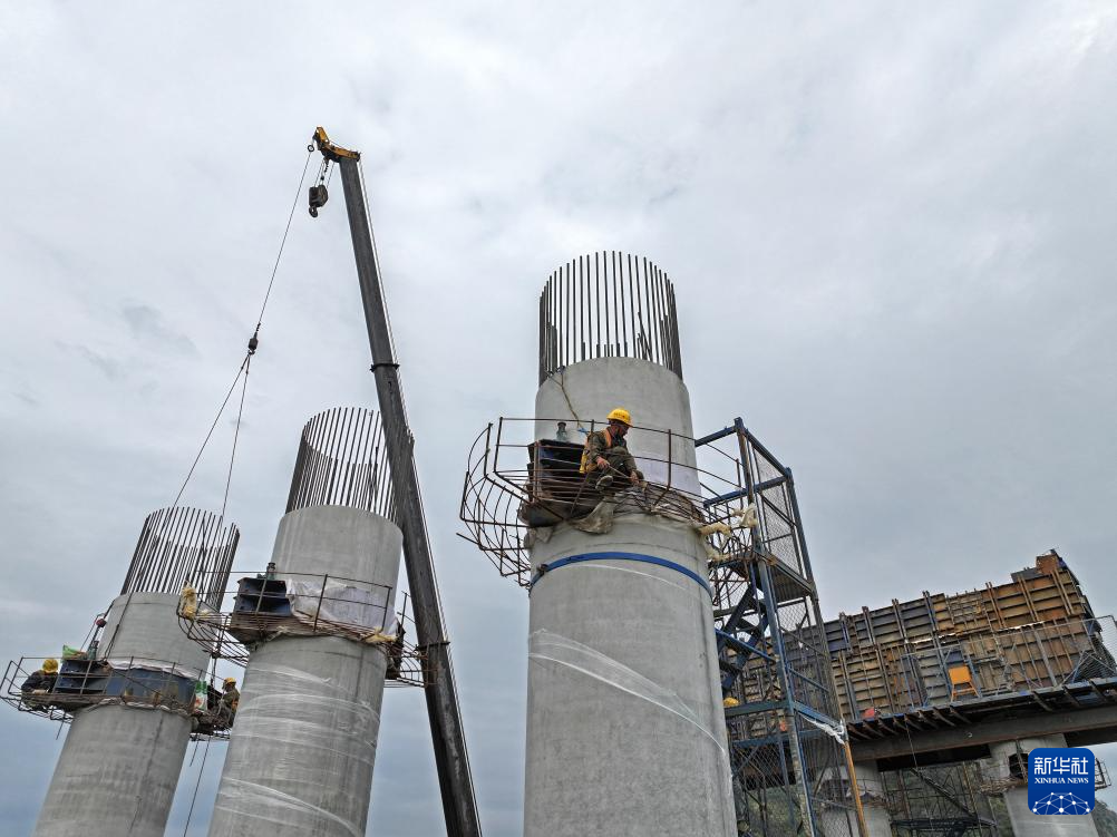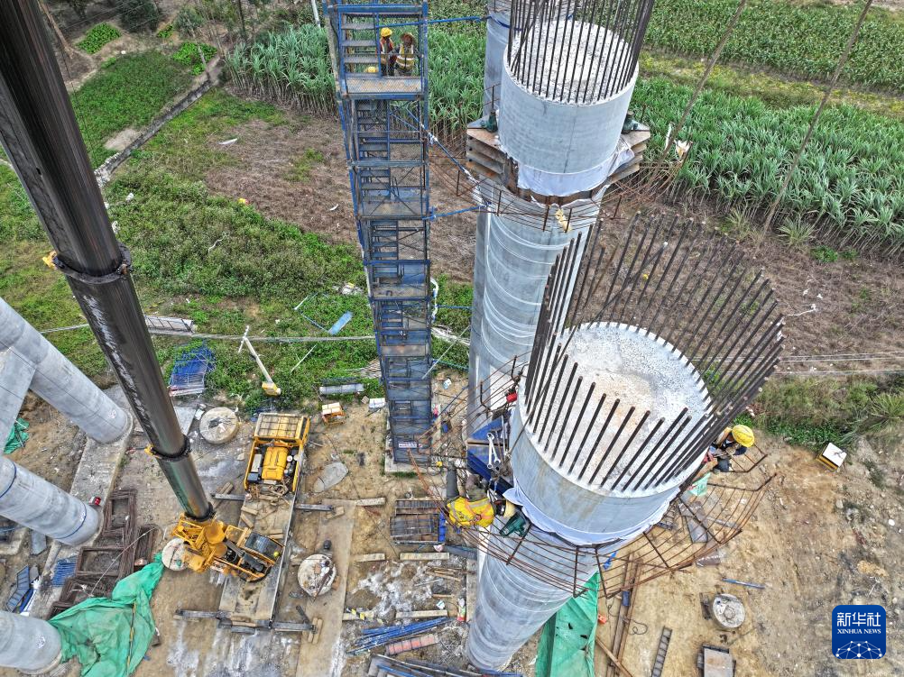 10月23日,中铁十一局的建设者在鱼宜高速公路羊额河大桥工地进行桥梁墩柱施工(无人机照片)。