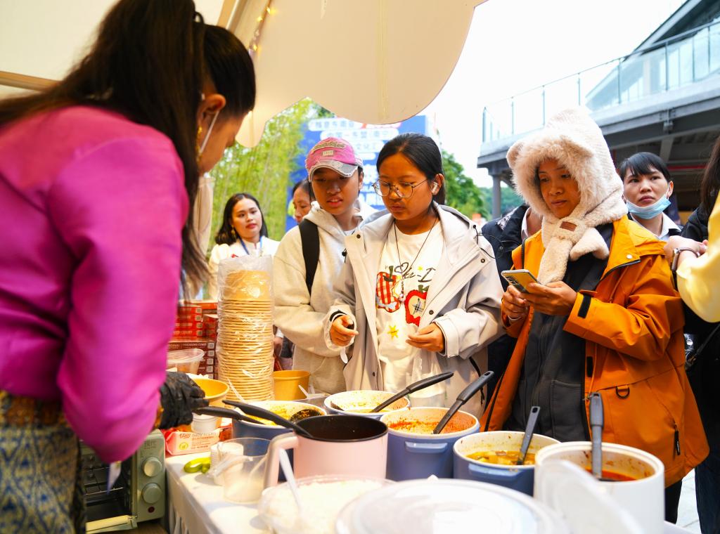 华灯初上,游客们被风雨桥上飘来的阵阵香气吸引而来。泰国船面、马来西亚虾片、越南春卷……100多家中外餐饮企业带着自家的拿手美食,亮相“筷意东南亚”2025年中国—东盟(南宁)美食文化汇活动。游客们在品尝异域美食的同时,还能听大厨们讲述美食背后的文化故事。