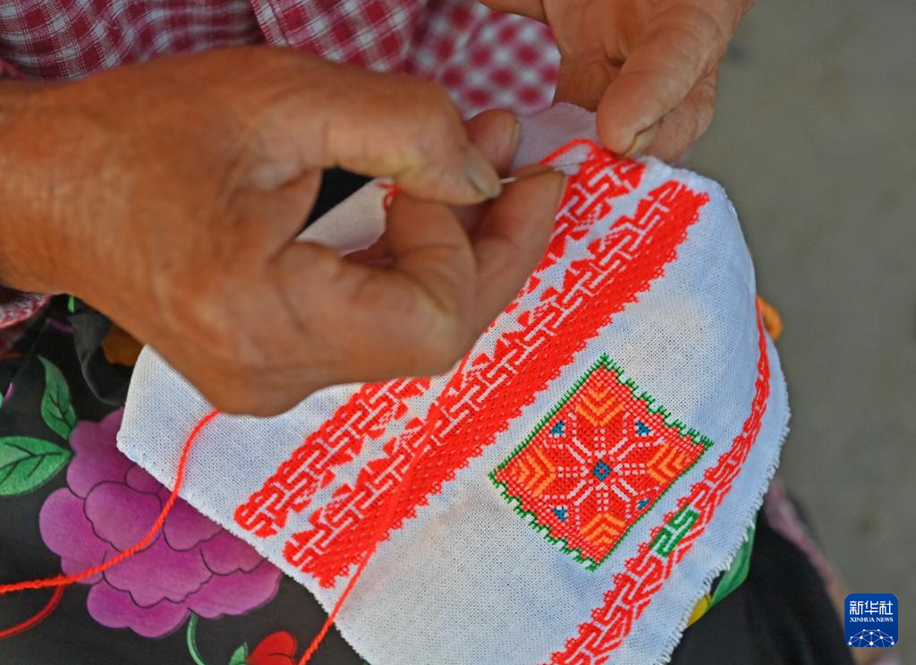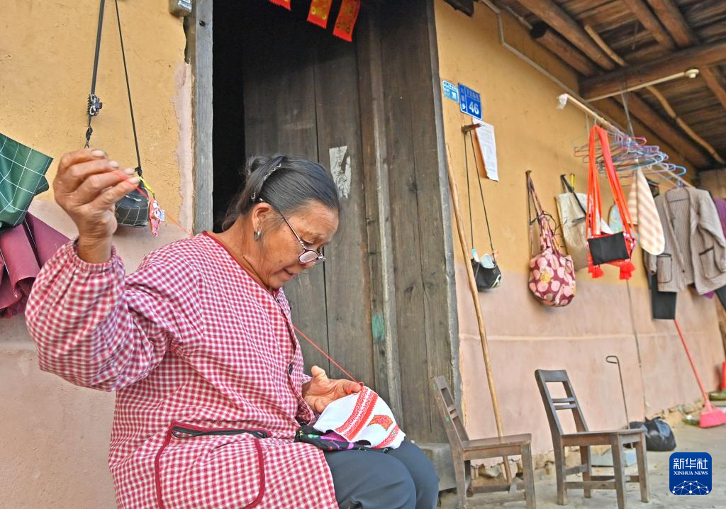 村民在广西金秀瑶族自治县六巷乡下古陈村刺绣(10月28日摄)。新华社记者 周华 摄