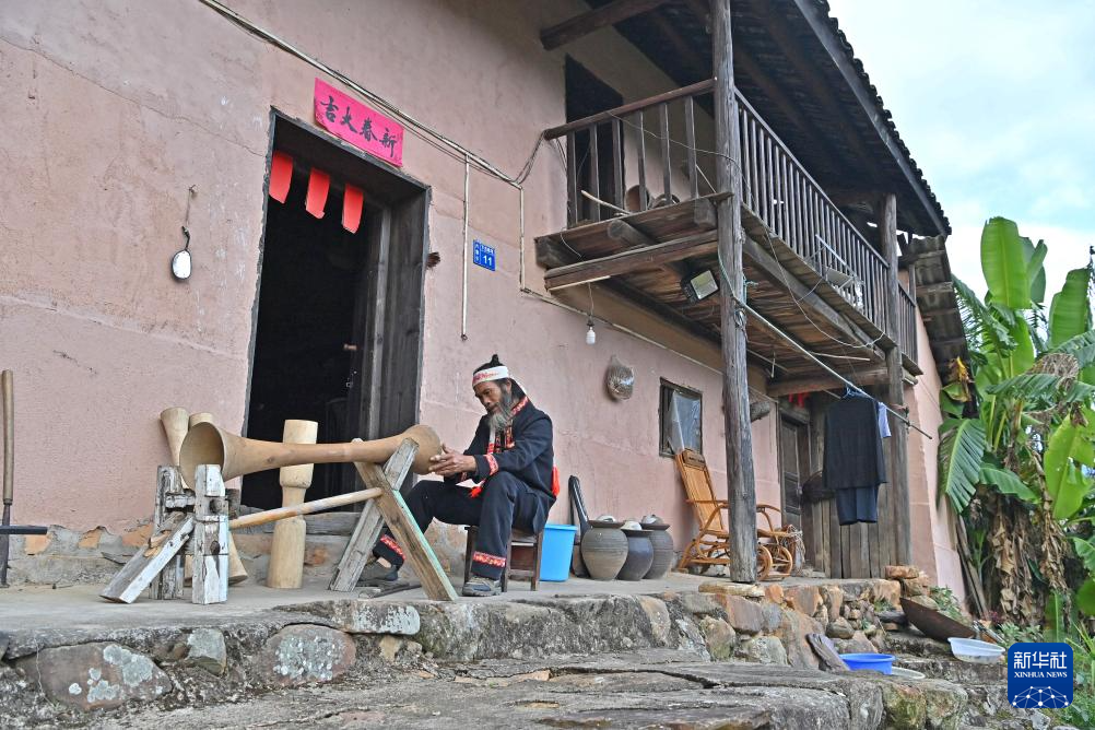 村民在广西金秀瑶族自治县六巷乡下古陈村制作黄泥鼓(10月28日摄)。新华社记者 周华 摄
