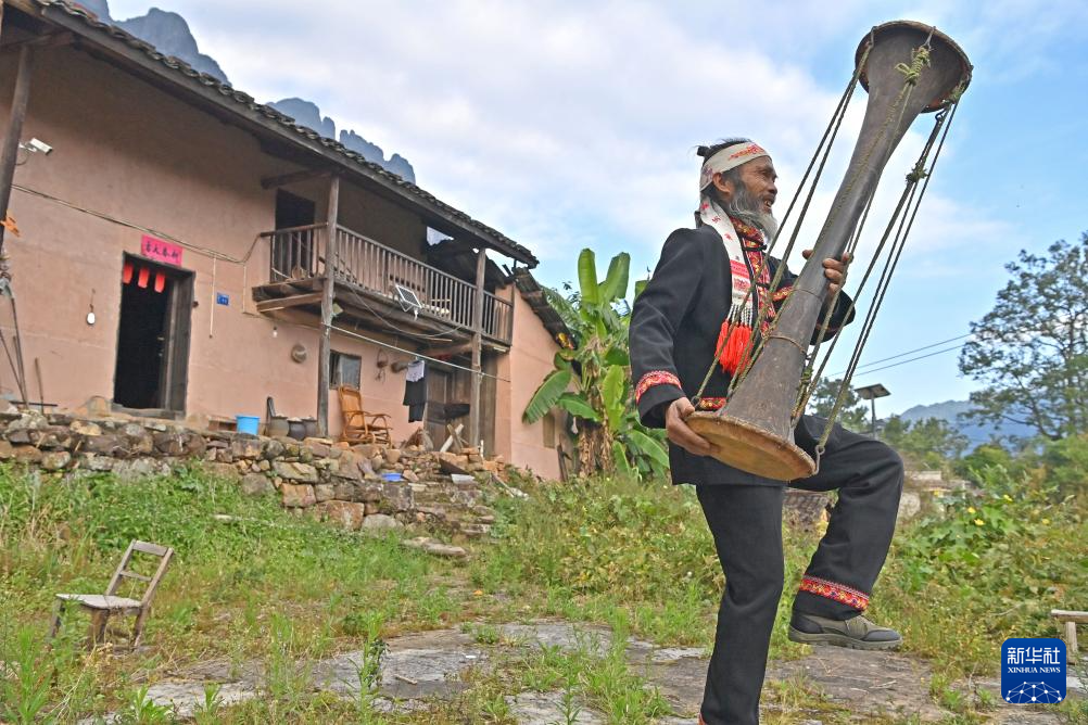 村民在广西金秀瑶族自治县六巷乡下古陈村跳黄泥鼓舞(10月28日摄)。新华社记者 周华 摄