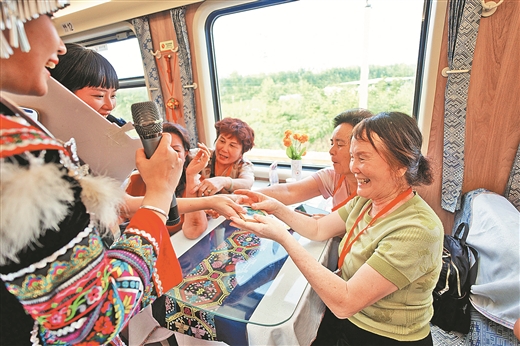 “原以为坐车久了会很无聊,但其实大家聊聊天、打打牌,看看车外的风景,时间也过得很快。”来自广东茂名的郜女士与几名友人结伴出行,她告诉记者,初次尝试火车“慢游”,体验感比预期要好。“我就爱热闹,车上氛围特别好,大家都是差不多年纪,一下就能聊到一块去,车上的工作人员时不时还组织表演和答题活动,也挺解闷的。”