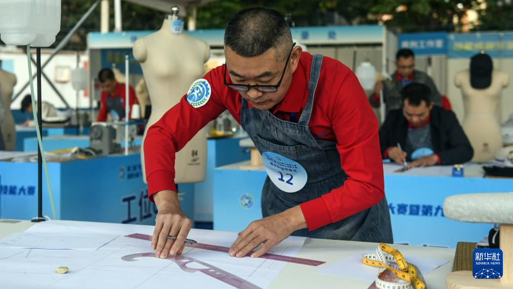 11月12日,在广西工业技师学院,一名选手参加服装制版师赛事比拼。