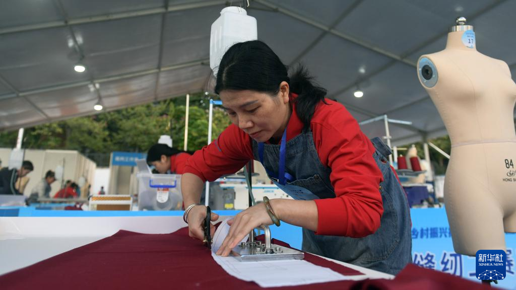 11月12日,在广西工业技师学院,一名选手参加缝纫工赛事比拼。
