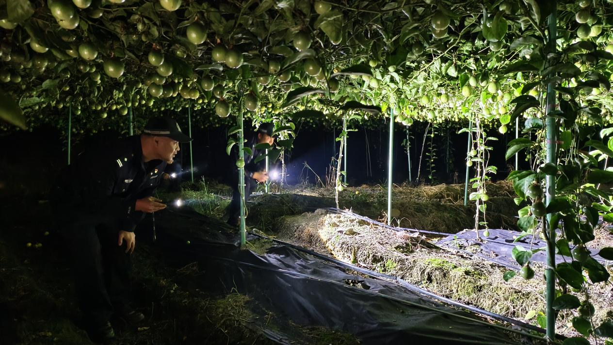 茶洞派出所警员手持手电筒穿梭在百香果果园中,细致巡逻,排查可疑情况。廖嘉敏 摄