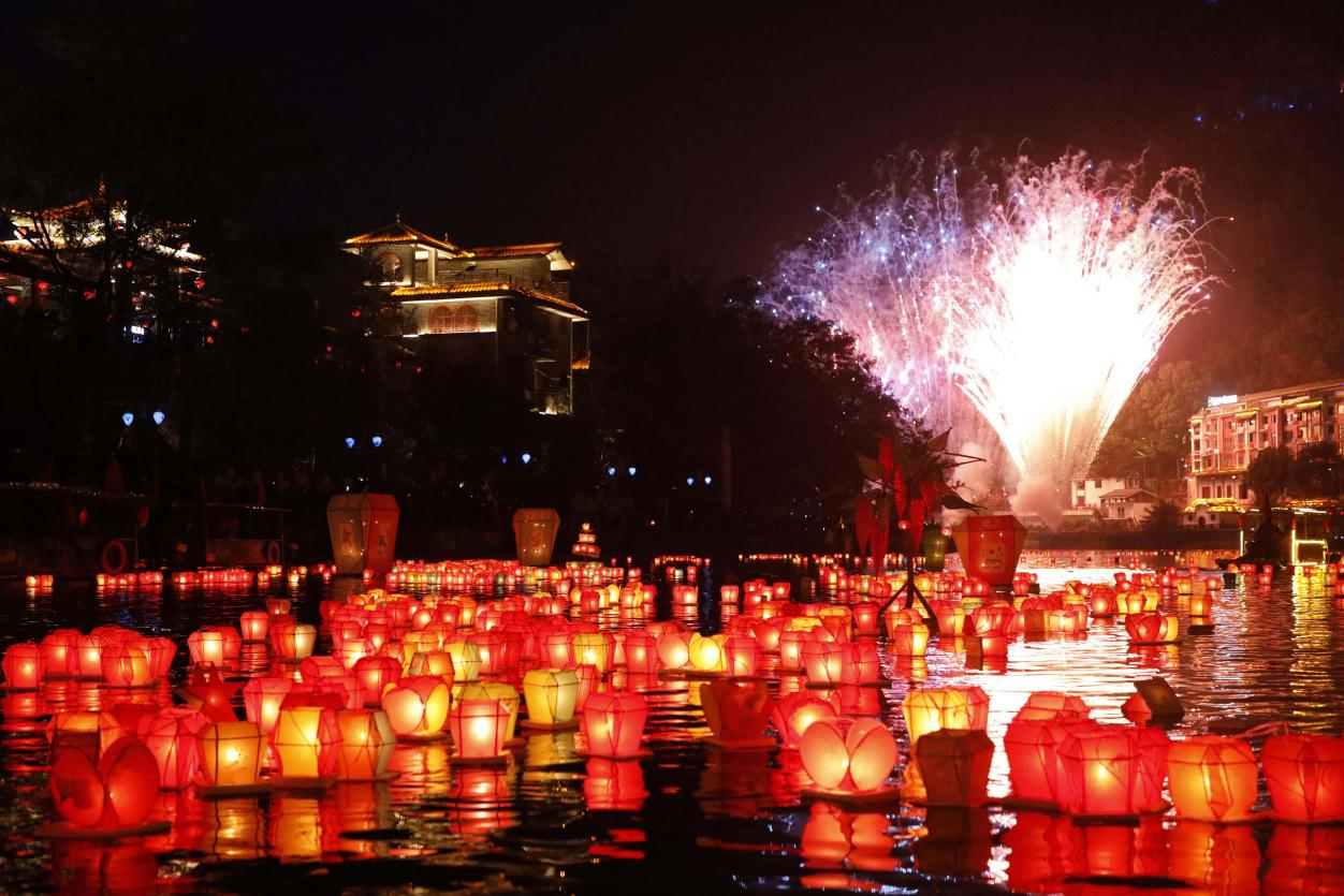 傍晚时分,嘉宾与群众共同参与传统的河灯漂放活动,成百上千盏河灯顺流而下,在墨色的江面上连成一条流动的光带。随后,资江上空烟花绽放,与河灯相映成趣,构成“上下天光,一江锦绣”的景象。